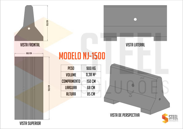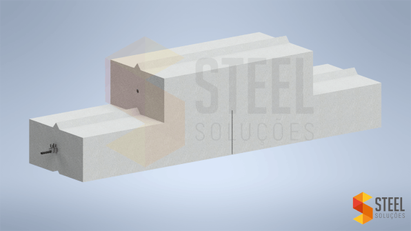 Pré-moldado de concreto, de acordo com as normas do DNIT, com mecanismo para proteção de cabo de aço (para garantir maior resistência) e ressalto na parte inferior (para permitir a drenagem no caso de chuva).