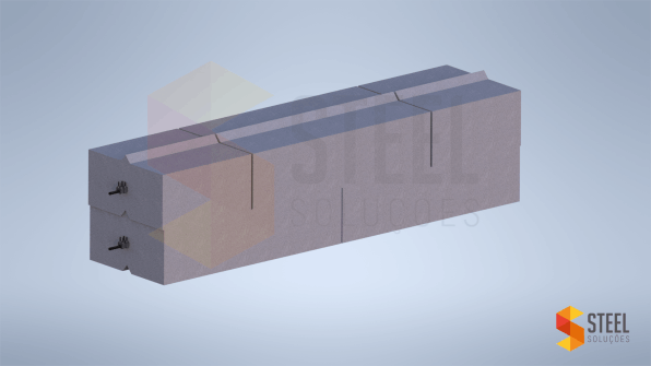 Blocos de concreto usinado, com encaixe na parte inferior e superior, e mecanismo para proteção de cabo de aço.